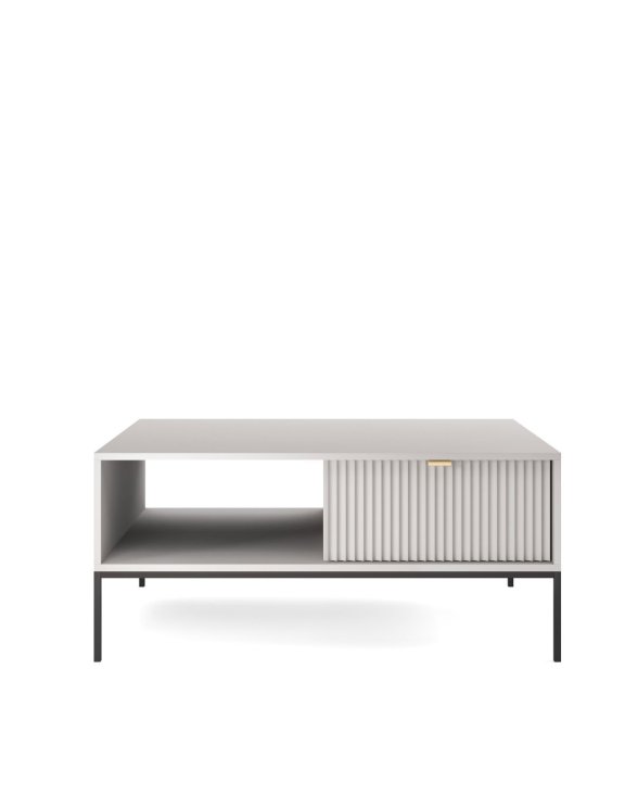 Predná časť stolíka je vyrobená z MDF dosky s hrúbkou 18 mm, čo mu dodáva eleganciu a štýl. Okraje sú zosilnené ABS plastom a hliníková úchytka dodáva stolíku moderný vzhľad. Nohy stolíka sú podopreté oceľovými rámami, ktoré boli práškovo lakované, čo zaisťuje ich trvanlivosť a stabilitu.