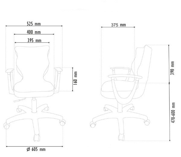 Rozmery: šírka stoličky s podrúčkami 525 mm, šírka sedáku 400 mm, šírka operadla 395 mm, priemer základne 605 mm, výška podrúčiek 160 mm, hĺbka sedáku 375 mm, výška operadla 390 mm, nastavenie výšky 470–600 mm.