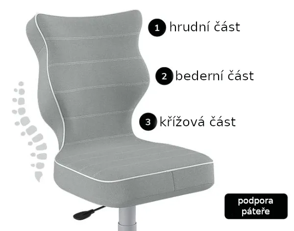 Tvarované operadlo podporuje driekovú, hrudnú aj krížovú časť chrbtice a pomáha udržať prirodzené držanie chrbta.