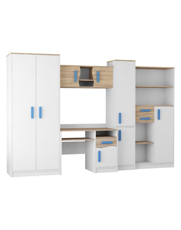 Súčasťou zostavy je aj dvojdverová šatníková skriňa s tyčou a policou na oblečenie a dve knižnice so zásuvkami, policami a skrinkami, ktoré pomáhajú udržať poriadok.