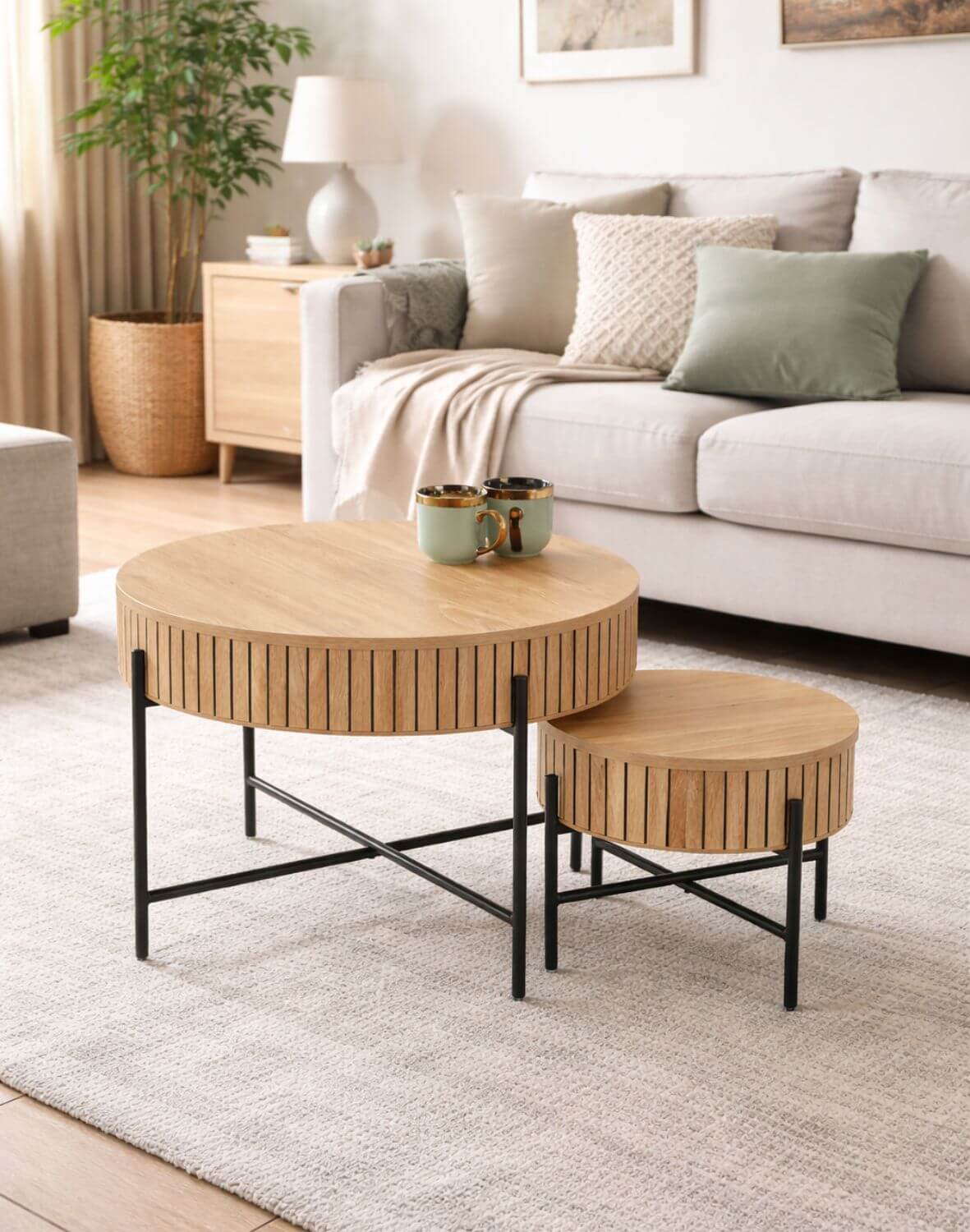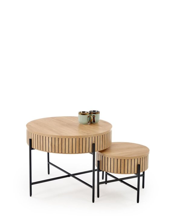 Dosky stolíkov sú vyrobené z MDF dosky v dekore prírodného dreva (melamín), ktorá vyžaruje teplo a vnáša do interiéru útulnú, prirodzenú atmosféru.