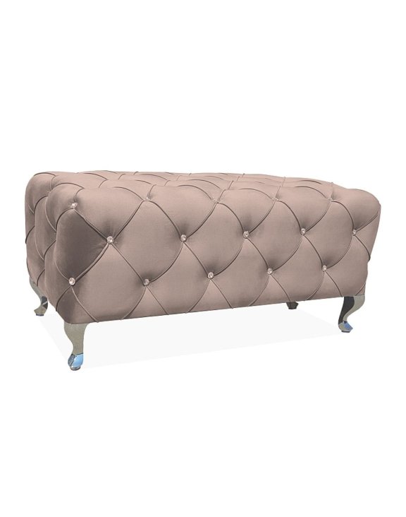 Ide o výnimočný kus nábytku čalúnený mäkkou zamatovou látkou v béžovej farbe, ozdobený prešívaním s dekoratívnymi kryštálikmi.