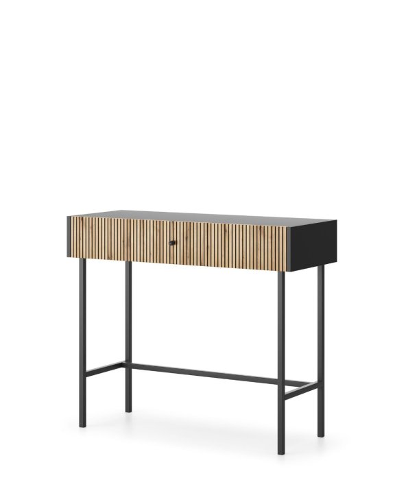 Toaletný stolík Diva je elegantnou kombináciou čierneho matného korpusu s čelom s lamelami v dekore prírodného dreva.