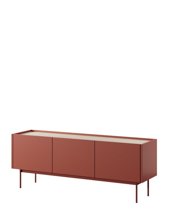 Kombinácia tehlového korpusu a čiel so svetlou hornou doskou v dekore dub linea vytvára jedinečný kontrast, ktorý sa skvele hodí do moderných a industriálnych interiérov obývačky.