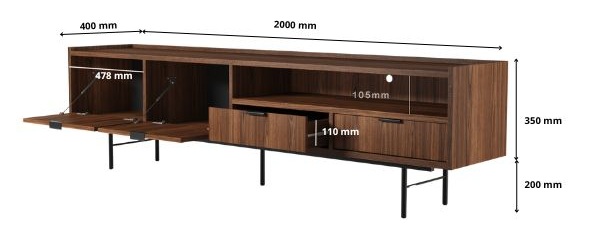 Optimálne rozmery – šírka 200 cm, výška 55 cm a hĺbka 40 cm umožňujú umiestnenie veľkého televízora a všetkých potrebných doplnkov.