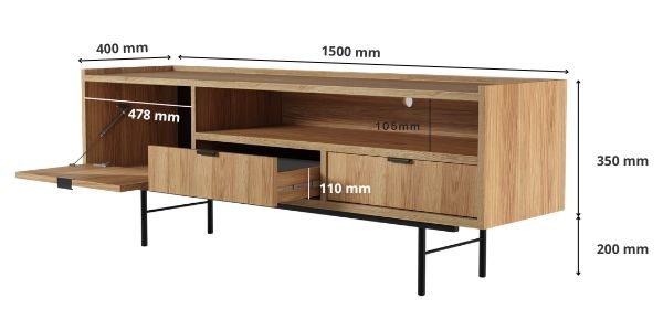 Optimálne rozmery – šírka 150 cm, výška 55 cm a hĺbka 40 cm umožňujú umiestnenie aj väčšieho televízora a všetkých potrebných doplnkov.