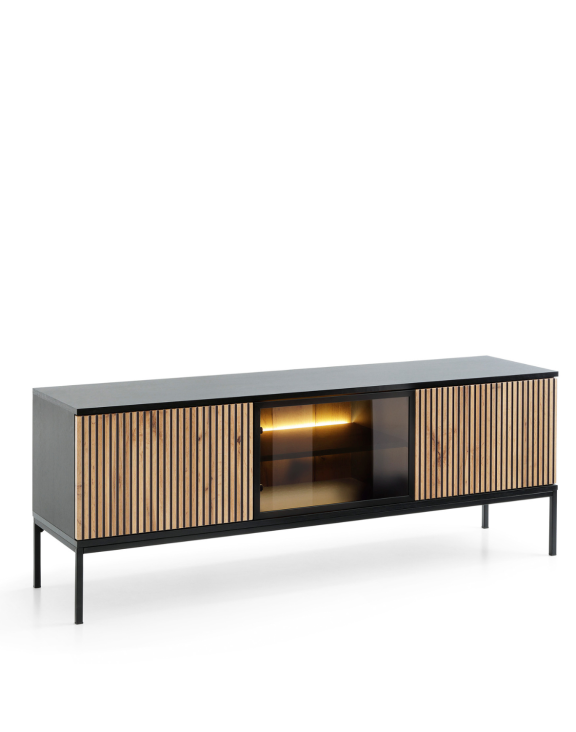 TV skrinka Sento (RTV154) značky Piaski, trojdverový s LED osvetlením v odtieňoch čierna a dub wotan je elegantný a funkčný nábytok, ideálny do moderných interiérov.