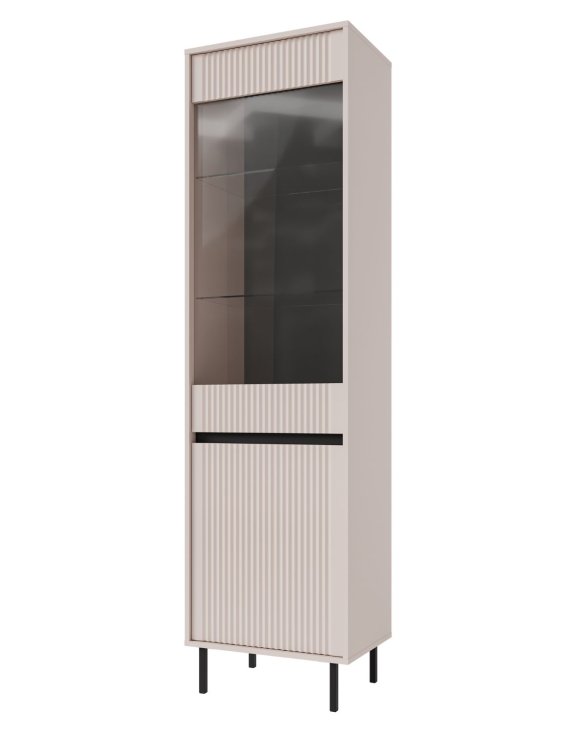Charakteristické vertikálne frézovanie na čelách dodáva vitríne osobitý výraz, zatiaľ čo presklená horná časť umožňuje elegantne vystaviť porcelán, sklo alebo dekorácie.