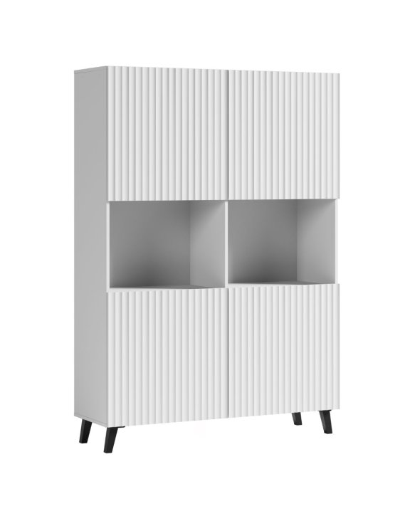 Vysoká komoda Phuket zaujme štíhlym vyhotovením a bielymi ryhovanými čelnými plochami v modernom dizajne.