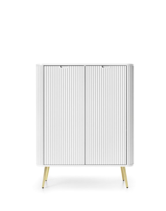 Vysoká dvojdverová komoda Zova (K103) do obývacej izby značky Piaski je štýlový a moderný kus nábytku s elegantným dizajnom v bielej farbe.