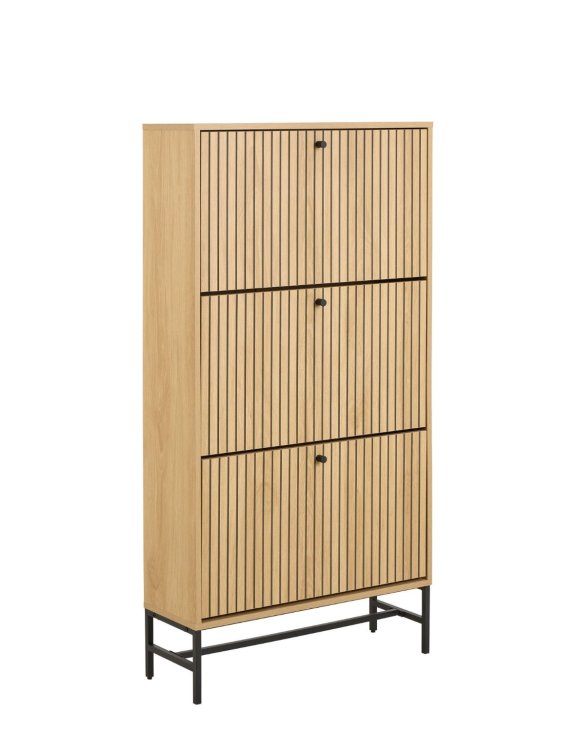 Skrinka je vybavená tromi priestrannými výklopnými dvierkami s praktickými úchytkami, ktoré umožňujú usporiadať obuv a zároveň ju elegantne ukryť, vďaka čomu predsieň zostáva upravená a estetická.