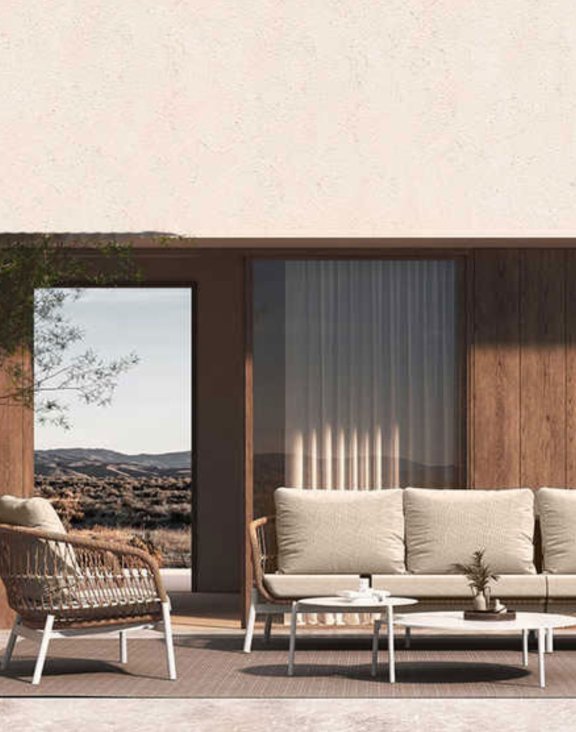 Operadlo rohovej pohovky a kresla je vyrobené z výpletu imitujúceho prírodné lano v prírodnej farbe, vyžaruje eleganciu a používateľský komfort. Jeho konštrukcia zo 7 mm hrubého technoratanu zaručuje výnimočnú odolnosť a jednoduché čistenie.