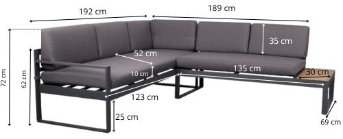 Konštrukcia súpravy je vyrobená z práškovaného hliníka v antracitovej farbe, čo dodáva nábytku elegantný, moderný vzhľad a zaisťuje odolnosť voči dažďu, slnku aj meniacim sa podmienkam.