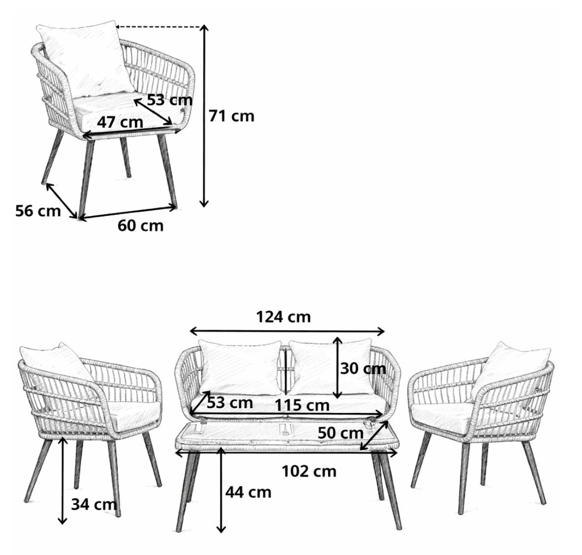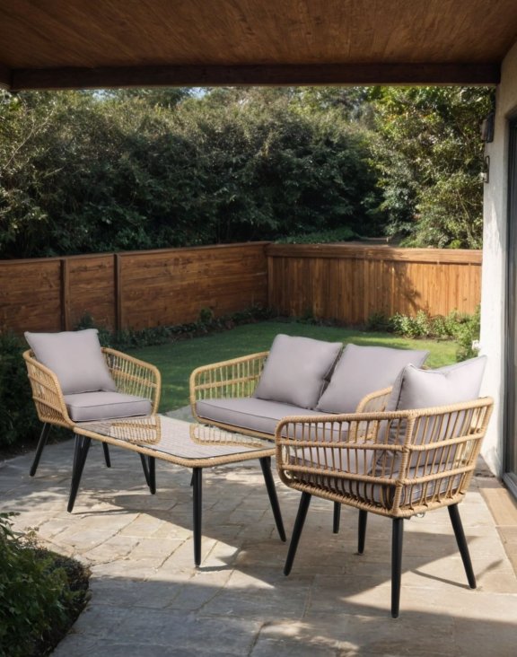 Konstrukcia zostavy je vyrobená z technoratanu, ktorý verne imituje prírodné prútie a dodáva nábytku elegantný a prirodzený vzhľad.