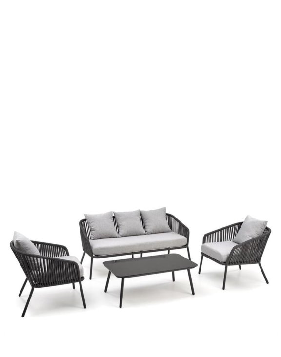 Sada obsahuje pohovku a dve kreslá, ktoré sú opletené tmavo sivým lanom, dodávajúcim nábytku moderný dizajn, a stôl so sklenenou doskou.