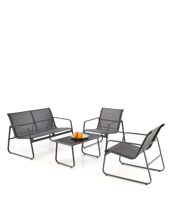 Zostava obsahuje pohovku a dve kreslá. Konštrukcia nábytku je vyrobená z kovu v šedej farbe, ktorá je potiahnutá šedou sieťovinou. Spolu so stolíkom so sklenenou doskou vytvára zostava dizajnový vzhľad.