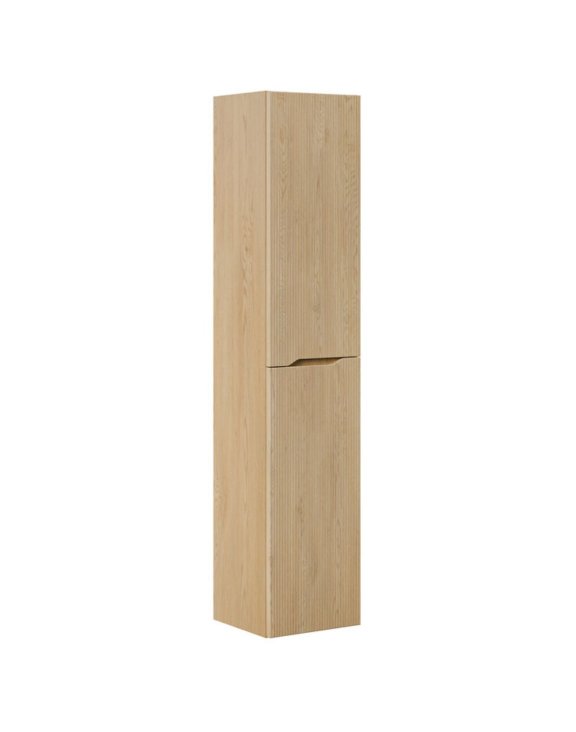 Závesná kúpeľňová skrinka – vysoký stĺpik s drážkovanými čelami v dekore dub cremona. Model ideálny do kúpeľne v škandinávskom, eko, japandi alebo modernom štýle.