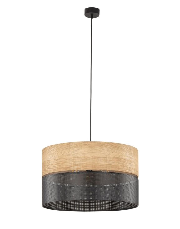 Tienidlo vyrobené z modifikovanej dyhy a čiernej PVC fólie s perforáciou vytvára zaujímavý vzor, ktorý určite obohacuje estetiku svietidla a dodáva mu jedinečný charakter.